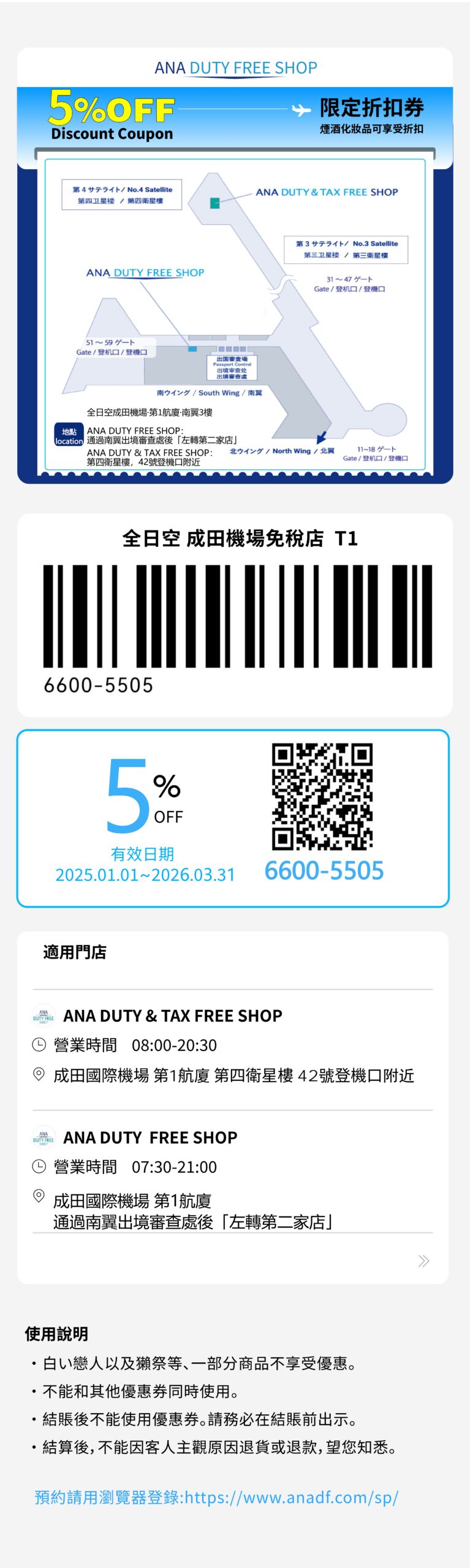 這邊有兩張成田機場免稅店的95折優惠券送給大家,有限定以下商店可以使用