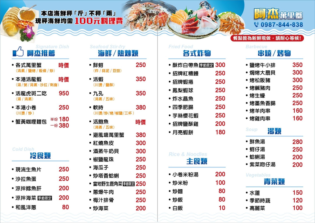 阿杰萬里蟹菜單如上,海鮮就是要秤斤,另外都需要加100元料理費