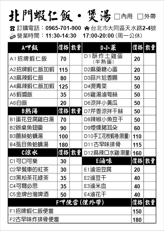 北門蝦仁飯·煲湯菜單