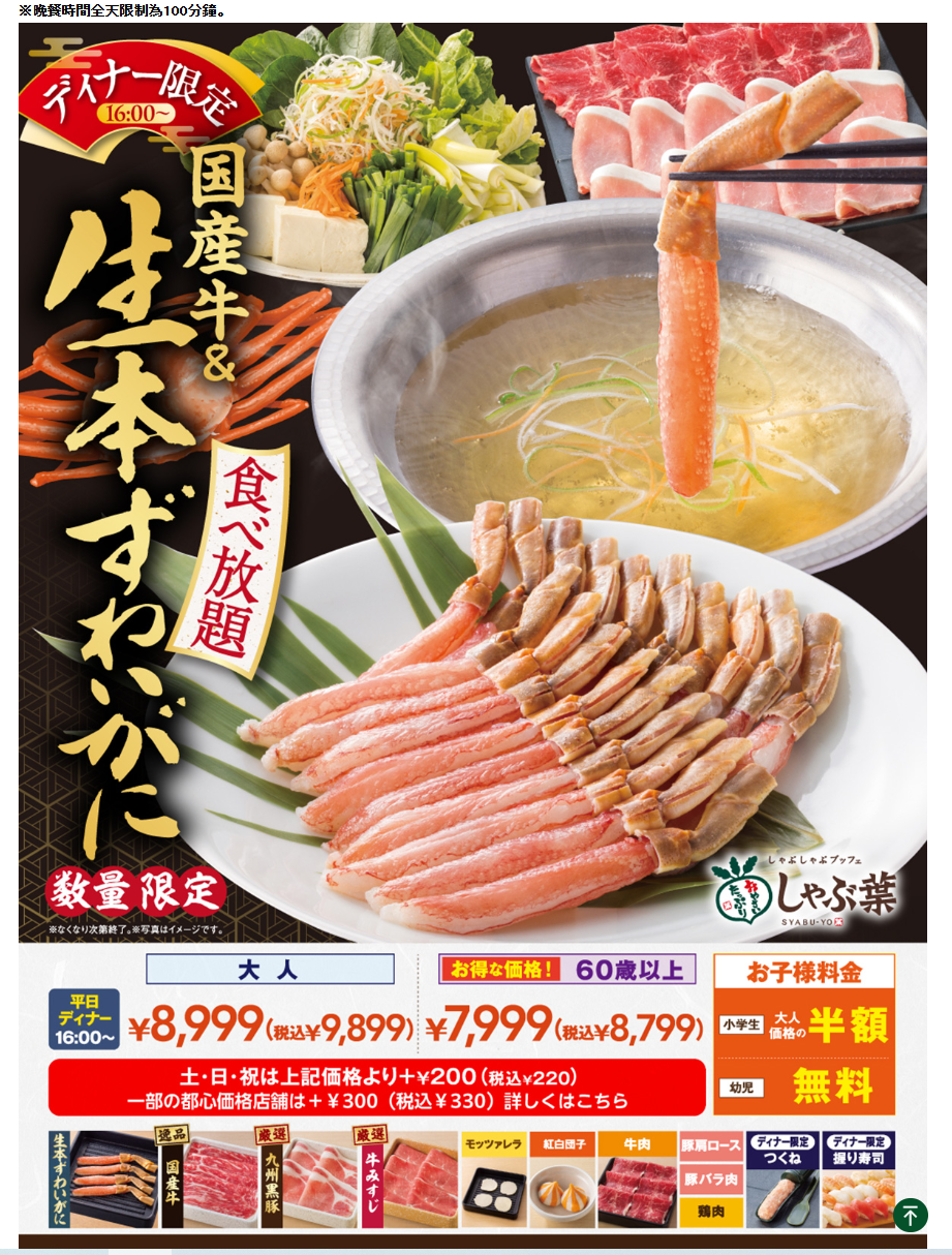しゃぶ葉2025冬天推出期間限定晚餐方案用的是可以下鍋涮的松葉蟹腳,不是邊角碎肉